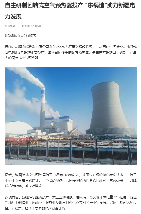 【川观新闻】自主研制回转式空气预热器投产“东锅造”助力新疆电力发展