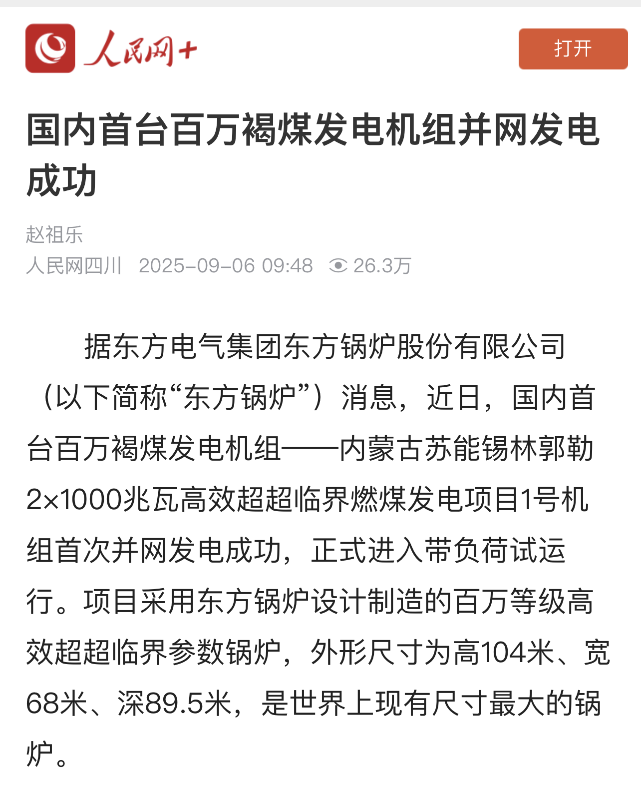 【人民网】国内首台百万褐煤发电机组并网发电成功