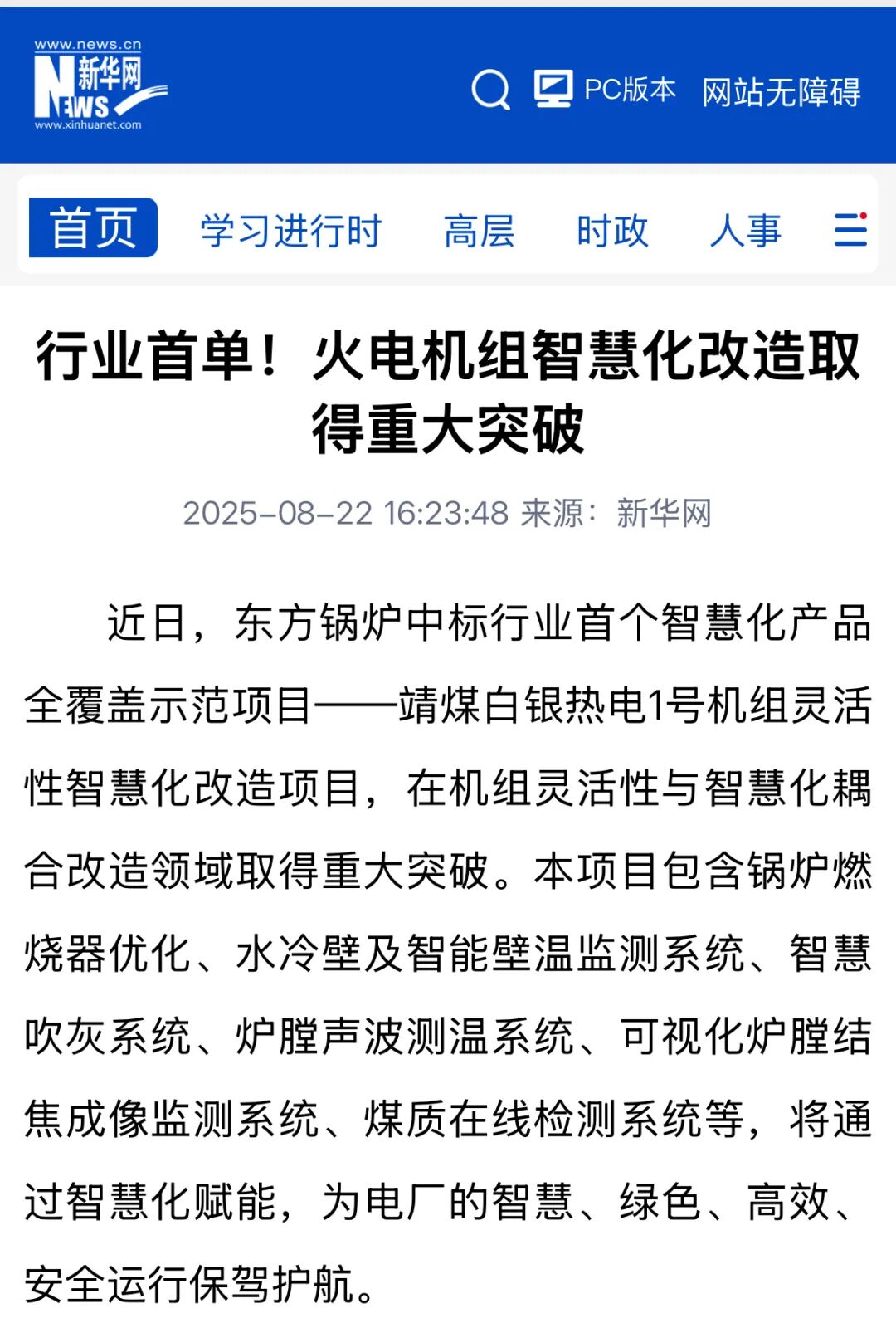 【新华网】行业首单!火电机组智慧化改造取得重大突破